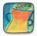 Square plate with shallow sides, the underglaze painting in bright colours showing a small fish leaping from a two-handled vessel, the rim of the plate finished with a black line.