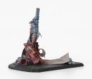 Abstract construction of strips and perforated planes (clay extrusions) wrapped around an upright form and tumbling towards the slate slab base, the ceramic red and blue glazes.