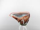 A small, heavy saucer of clear glass supports a cone-shape of clear glass treated with vigorous milky swirls of grey, chocolate and blue-green with passages of irridescence; rimmed in rust-red: the vessel is dramatically deformed and swept to one side.