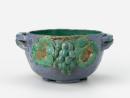 Handbuilt bowl with two horizontal hands each comprising two rolls of clay, each side with a motif of grapes and vineleaves in relief, the vessel glazed in lavender blue, the relief decoration and interior in shades of turquoise/green.