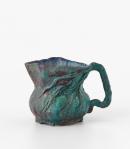 Handbuilt jug in the form of a tree-trunk, the branches represented in relief on the body, the exterior decorated with turquoise green and lustrous red mottled glazes, the interior in blue.