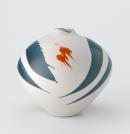 Matt white globular pot with small irregular mouth, splashes of blue and red-orange.