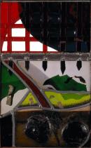 A rectangle of fused, leaded and painted glass in three broad horizontal divisions; the lower section is in khaki coloured glass with two applied medallions, the central section of a stylised landscape with fragments of olive green and emerald green glass with a deep red diagonal band; the upper section is constructed as an arched lattice or portcullis in vivid red in front of a segmental blue panel; the whole is fixed in a wooden frame.