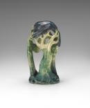 Lamp modelled as three sinuous tree trunks supporting a canopy of windswept branches above a dome designed for a light fitting and decorated with two gum leaves in relief, the whole decorated in mottled green with dark blue on the foliage and roots of the trees