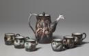 Upright coffee pot decorated with head and plants, 6 mugs decorated with human faces.
