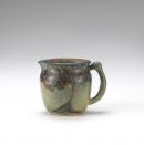 Jug with shaped handle, decorated with a tree on each side in brown and blue-green on an olive/grey ground
