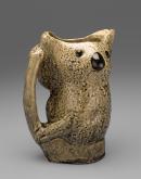Moulded jug in the form of a koala grasping a gumnut twig which forms the handle, decorated in grey-green, with black eyes and nose.
