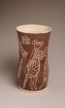 The upright vase is decorated in sgraffiato technique, incised through a red-brown slip to reveal the cream body, and glazed motifs inspired by Arnhem Land x-ray style include kangaroos, crocodile, shield, boomerang and a sugar glider-like spirit figure.