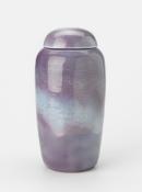 The tall pot with a low domed lid is decorated with Lowe's 'misty purple' glaze whose subtle variations ahieve with a low-fired glaze the effects of Chinese chun glaze and also evoke a distant landscape.