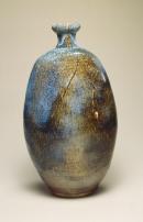 The pot has a slightly irregular upright ovoid body, a narrow neck and cupped mouth. It is covered with a mottled blue and brown (jun) glaze subtly interrupted by three diagonal lines (in wax resist) and shading to olive and brown towards the base.