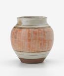The globular jar is decorated with a geometric design in tan and greyish white, defined by brown horizontal lines above and below, the foot revealing the brown stoneware body.