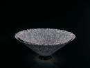 The kiln cast form is double coned and widely flaring from a black circular base. The glass is mottled with black, blue and pink coloured markings that radiate to the uneven brim.