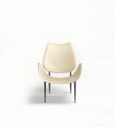 "Scape" armchair, curved and shaped back, arm 'petals' upholstered in off white vinyl, metal undercarriage.