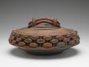 Squat, wheel-thrown vessel with hand built additions, high-fired raku technique.