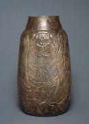 Near-cylindrical body tapered to mouth, carved decoration of owls, bronze over green.