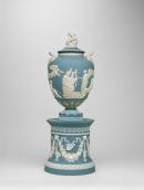 Vase with serpent-shaped handles from Medusa heads, sits on socle foot on a square base. Finial on lid in the form of winged horse Pegasus. Relief decoration shows 'Apotheosis of Homer'. Drum-shaped pedestal, decorated with festoons and trophies, is based on the form of a classical urn.