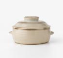 Lidded circular casserole, wavy ledge handles on low vertical sides. Pale grey glaze trimmed dark grey.