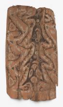 Two panels joined with cane loops with 4 triangular faces of either zoomorphic or anthromorpic figures in centre. Painted half-herringbone in wavy and circinate patterns surrounding the faces.