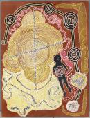 The circular configuration crossed by linear bars signifies the important site of Yumari in the artist’s mother country, as identified by Bobby West Tjupurrula. The site is associated with the story of the old man Yina, who is punished for copulating illicitly with his mother-in-law at Yumarinya (mother-in-law place). His body when lying down formed an X-shaped rockhole at Yumari, a shape which articulates a physical landscape form and an ancestral body. Concentric circles depict sit-down sites where people rested, which are linked by straight journey line motifs, showing that there has been much travelling by many people. The patterned motifs to the right are ground paintings. The design has a raw vitality and visual power achieved through a use of intense pattern with dotting.
