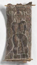 Made of two panels of palm bark, held at the top and bottom between 2 split bamboo poles, tied with vine. Across the panels painted is a large figure of a man, 2 parrots in profile on his head, 2 snake forms on his sides and another bird on the lower left.