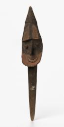 Carving with a figure head on one end and round pointed on the other end. Head pointed with ridge down centre of forehead. Brows under cut vertically with a prominent nose, pierced. Face flattened and curving up to chin. Eyes 2 short round protruding stalks, mouth carved. Traces of pigment.