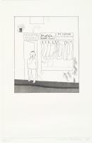 illustrations (layout features) laundries (businesses) line drawings (drawings) men (male humans) signage storefronts street scenes