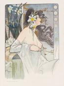 drapery (representations) flower (motif) hairstyles iris (plant) nudes (representations) stars (motifs) women (female humans)