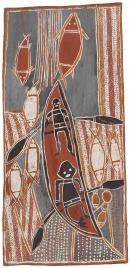 The artist depicts a story associated with Djambarrpuyngu mortuary rites and the journey of the soul of the dead to its spiritual resting place. Men are looking for fish in a river off the south end of Elcho Island. The wet season rains come in and the current sweeps men and fish out to the sea. Thus the soul of the dead returns to its destination, borne on the swollen floodwaters of wet season rivers. As it is carried along in the water, it has to avoid being speared as a fish, eaten by a bird or caught in a trap.