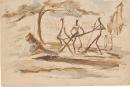 pen and brown ink, coloured ink wash