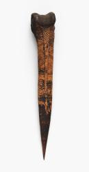 Long straight pointed dagger with central ridge running ¾ of way to the top. Handle is carved from the condyle, the underside hollowed out and blackened. The surface of the upper side and handle is decorated with incised concentric circles, chevrons and zig zag lines and is yellow and black.