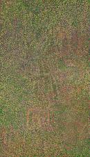 Emily Kam Kngwarray celebrates the lush abundance of her Country after rain, when fresh grass shoots and the small bright green leaves of (pencil yam) appear in the earth. This sense of Country being made green and lush is symbolised by the vibrant palette of light greens and ochre colours. The intersecting lines indicate the artist’s anwerlarr Dreaming: its tuberous roots beneath the ground, the cracks which form in the soil as it ripens, the place where women dig for it, and the striped awely body designs worn by women in ceremony.