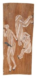 Wally Mandarrk was an integral artist in the development of contemporary bark practice. Born at either Kurlidjkah or Djidkul, Mandarrk was a prolific painter on both rock and bark. Preferring to work in isolation, he rarely visited the community hub at Maningrida. He was believed to have close contact with Mimih spirits in the escarpment Country, and they were a constant theme in his oeuvre. Mimih spirits and human reproduction III is one of three works, all acquired by the NGV in 1990, where Mandarrk explored the philosophies of fertility.