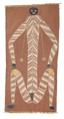 Curly Bardkadubbu painted on bark for Maningrida Art and Crafts from 1970 onwards, living at Namokardabu outstation. He was renowned for his vigorous painting style, exploiting both the x-ray and rarrk styles characteristic of Eastern Kunwinjku art. Common subjects included namarrkon (lightning), ngalyod (rainbow serpent), namanjwarre (estuarine crocodile), ngaldadmurrng (saratoga), birndu (mosquito), and kandakidj (red kangaroo).
