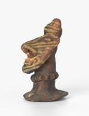 The solid clay figure head set on a wide and round base. Around the neck is a ridge running around with 15 deep indentations. The head is flat with an oval face, prominent nose, eyebrows are indicated by a ridge across the face and slit eyes. The face decorated with painted lines, chevrons and dots.