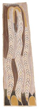 George Milpurrurru was born in his Country, the bush at Badigalimak near Gulpilil, at a place called Ngalyindi. He was the eldest son of Ngulmarmar (c. 1911 – c. 1977) and his first wife, Dhapalany, and the elder brother of bark painter Charlie Djurrutjini (born 1952) and weavers Elizabeth Djutarra and Robyn Djunginy. A former ceremonial leader of the Ganalbingu people, Milpurrurru belonged to the Gurrumba Gurrumba clan, the Bulain subsection and the Yirritja moiety. Milpurrurru was taught to paint by his father, Ngulmarmar, who he used to watch paint. He was also taught by his grandfather Lululna (c. 1910 – c. 1973) and his uncle Gomindju (c. 1915 – c. 1979). He remembers receiving ten pounds for paintings from interested buyers, including Dorothy Bennett and Alan Fidock – early collectors of First Nations art – but his work probably became recognised during the late 1960s when several bark paintings were collected by ethnologist Helen Groger-Wurm for the Institute of Aboriginal Studies, Canberra. With the death of his father around 1977, Milpurrurru assumed more ceremonial responsibility and with increasing ritual knowledge broadened his subject matter and refined his painting technique, encompassing several distinct styles.
