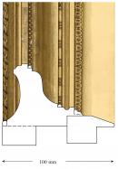 The frame uses small runs of composition ornament on a wooden chassis. The profile is mitred and nailed across the corners. The mitres are not hidden and rely on precise cutting and joining. The corners are re-enforced on the reverse with blocks. There is burnished water gilding on the taenia of the leading edge (on a black bole), oil gilding elsewhere. The slip is water gilded.