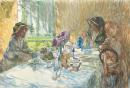 dresses (garments) flower (plant material) interior spaces (spaces by location) lunches seated figures sun hats women (female humans)