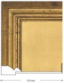 This frame has a simple profile, mitred and pinned at the corners, gilded with gold leaf direct to the oak timber. The framing features the original cardboard matt, which is gilded with gold leaf and finished with a matte size. The bevel of the matt is also gold. The backing-board is made from two wide, thin planks of wood pinned into the rebate with flat, forged nails and taped with brown paper around the edges.