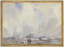 A simple watercolour frame in the manner of gilding direct to the wood, this frame appears very slight for the scale of the work. It is unusual and impressive to see a watercolour framed without a matt in such a minimal border.