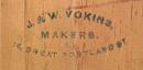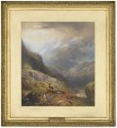 The watercolour is stretched over a blind stretcher. An impressed mark of the maker is at the centre bottom of the wooden backing board, suggesting Vokins prepared the support. The frame maker is identified by an ink stamp in the centre of the reverse of the same board. A pencil inscription on the reverse of the frame notes, Gilt Mount. The design work of the frame is a mixture of Gothic and Celtic motifs to link the frame to the subject of the painting. The frame is finely crafted and a beautiful example of late nineteenth-century watercolour presentation.