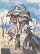 watercolour, pencil and coloured wax crayons