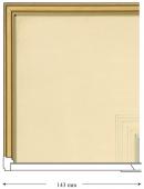 This small-scale frame is made from a single timber section, mitred and nailed at the corners. The surface appears to be high-quality gold coloured paint, sprayed onto a pale base. The watercolour is housed in a window mount consisting of three layers of board with a 45° bevel, painted white at the sight edge, with ink and wash delineation of the border.