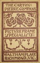 3 References to the Carton Pierre Company are to a decorating company at 110 Franklin Street in 1904 and 235 Lonsdale Street in 1906–1909, though they appear under the heading of Picture Framemakers and Dealers. These are addresses for the city of Melbourne, unlike the one on this label. It is not unusual for framing businesses to have a city address and a suburban workshop premises. The date of the frame remains ambiguous. The company does not appear to be listed after 1909, but this date is earlier than the proposed dating of the watercolour. Hilary Maddocks, ‘Picture Framemakers in Melbourne c 1860–1930’ in vol 1. Frames, Melbourne Journal of Technical Studies in Art, University of Melbourne Conservation Service, 1999.