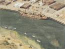 aerial views cargo vessels channels (water bodies) docks (general waterside structures) ports (settlements) ships warehouses wharves