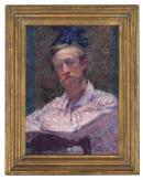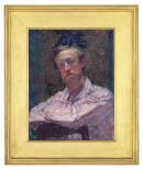 Australian medical student William Maloney was a friend of Russell and Tom Roberts in London in the early 1880s. This work was a gift to Maloney on his return to Australia in 1887, and Russell may have hoped that Roberts, back in Melbourne, would see it as a demonstration of Russell’s new Impressionist technique. In the background is an East Asian scroll, indicative of Russell’s admiration of Japanese art at this time.