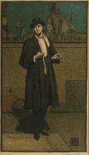 Napier Waller was one of the first Australian artists to make and exhibit linocuts. He learned the technique in England while convalescing after the amputation of his right arm. In this poignant self-portrait print, Waller depicts himself with two arms, posing with a cigarette in elegant evening attire. He is standing in front of his mural War in the Melbourne Public Library (now the State Library of Victoria), which he completed in 1928. The mural was recently restored and can be seen above the library’s marble staircase.