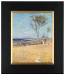 The reframing of Near Heidelberg coincided with the Arthur Streeton exhibition of 1995. The new frame was based on the frame on Tom Roberts Portrait of J Rivers Allpress, a flat plank of oak. For Near Heidelberg the oak was ‘Japanned’ in line with recollections of the daughter of the previous owners of the painting.