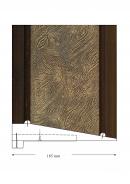 This frame is made from a single plank of softwood, 9 ins. wide and 1½ ins thick. The plank has been tapered across its width and joined at the corners with lapped halving joints. These joints are mitred on the face and part- mitred on the reverse and are secured with screws. The working edge is built up with an additional strip of timber. On the front of the frame the frieze panel is defined by the addition of half-round softwood strips towards the outer edge and near the sight edge. The strips are nailed in place. The frieze itself is covered with embossed wallpaper, or Japanese leather paper. The pattern is of peacocks on a background of rippled water or knotted wood. The frieze section is surfaced with gold coloured paint, the relief of the design being defined by a wash of darker paint. The remaining timber surfaces of the frame are stained dark.