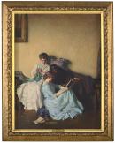 The frame fits stylistically with a group characterised by this reverse profile form, the most notable being the frame on Frederick McCubbin’s Winter Evening, (61-2) also by Thallon. A similar profile is to be found on McCubbin’s Autumn Morning, South Yarra (3164-4). The flat is more often sanded but the frames are notable for the strong impact of the projecting leaf torus close to the edge of the painting and the pronounced reverse bevel, which pushes the picture plane forward. Note the frame on the back wall of the painting. By interesting contrast, two other paintings in the collection by Wheeler, Le Bain du soir (1770-3) and The swimming pool (1772-3), are framed in Louis XV revival frames, also by Thallon, and carrying a similar label.