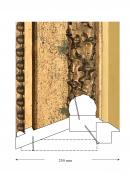 The frame is made from a wooden chassis with a cast plaster, imbricated oak leaf torus on the inner edge, a large-scale string and bead ornament to the back edge and a bevelled, gilded slip. The reverse bevel of the flat carries a ‘stucco’ surface where we might otherwise find sand. The bevel section is butted up to the section which carries the oak torus and nailed and glued in place. The torus sections repeat at 28.5 cm and are nailed as well as glued into place. The basic form is mitred at the corners, reinforced from behind with triangles of recycled timber, nailed in place. The slip is water gilded on a red bole. The rest of the frame is gilded with false gold on a black base. The painting was originally held in the frame with wooden angle blocks.